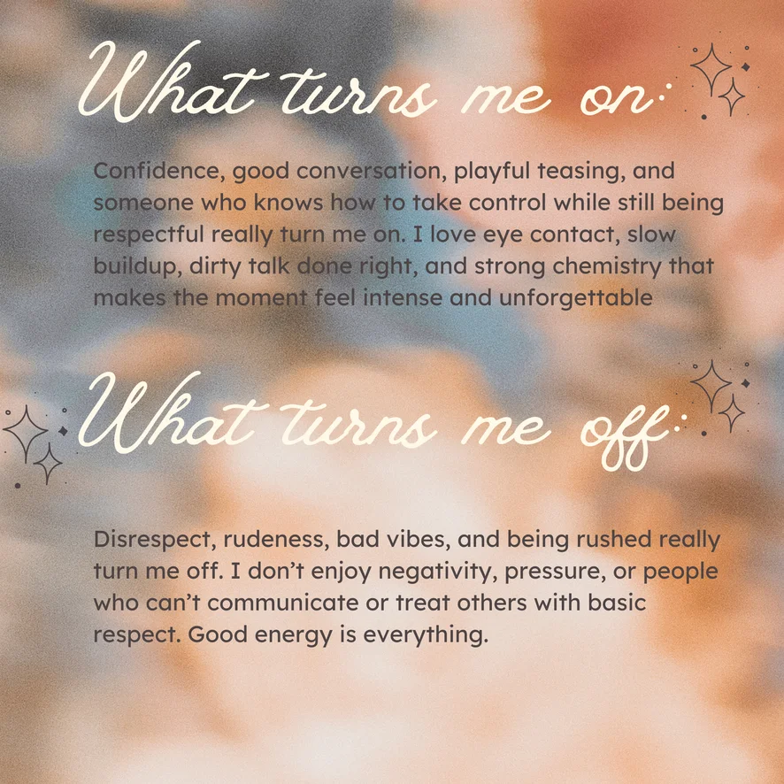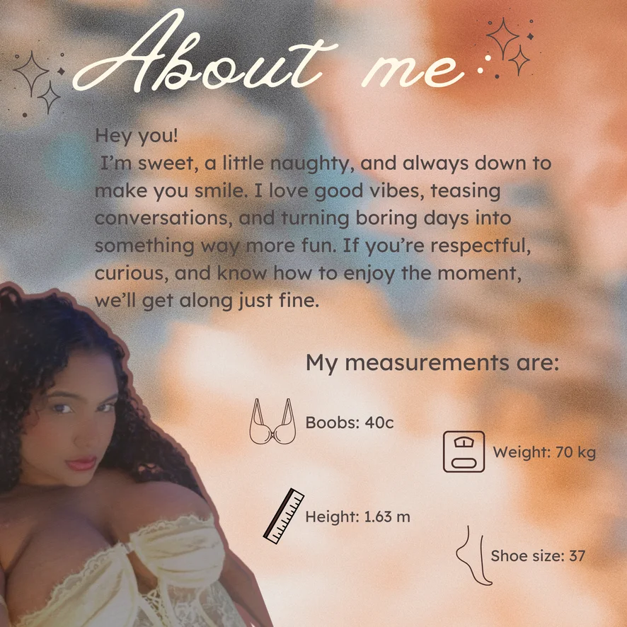 وضعية الكلب, أهيجاو, صفع, رقص مثير, تقييم الزبر, كلام بذئ, جلوس على الوجه, تعري, صدر عارٍ, رقص التويرك, تحت التنورة, خف الجمل, فتيشية القدم, ألعاب حلمة الصدر, Spit Tits, قذف المني, تصبيع, نيك الصدر, العادة السرية, رقص التعري, قضيب صناعي أو هزاز, مص, راعية بقر, Shower show x 250 tks extra, Smoke x 100 tks extra, عرض زيت, لعب الأدوار, نشوة, فاضح جدًا, نطر كساس, حلق عميق, ألعاب جنسية